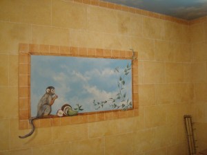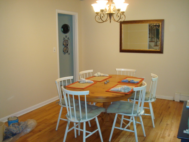 Some of you know that an artist lived in our house at one time. She was quite good, but we decided we didn’t want to keep all of the art that she painted on the walls. The biggest transformation so far is the dining room. The faux brick and monkey are gone, and now the walls sport Benjamin Moore’s “Barely Beige.” I imagine if the artist could see the room now she would think it quite boring.