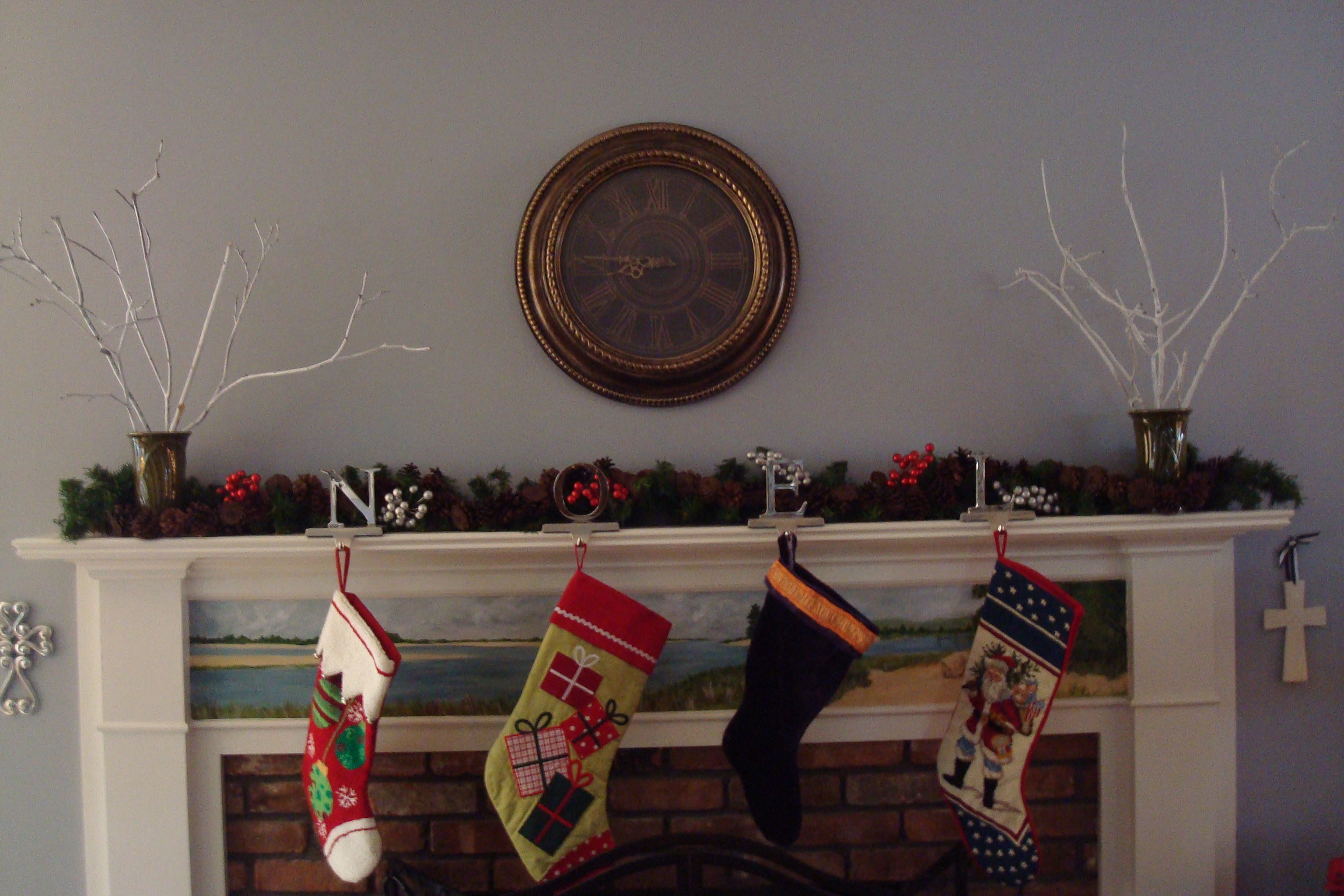 This year I tried something different and it is still a work in progress. Motivated in part by a desire to save some money, I decided to take advantage of the abundance of tree branches and twigs surrounding my house. Anna and I sprayed painted some twigs white (today I will add some twigs spray-painted silver) and stuck them in the green vases I already owned. The look is natural, a bit rustic, with a hint of artsy funk. I like it. Perhaps my humble efforts will spark a new idea for your Christmas decorating.