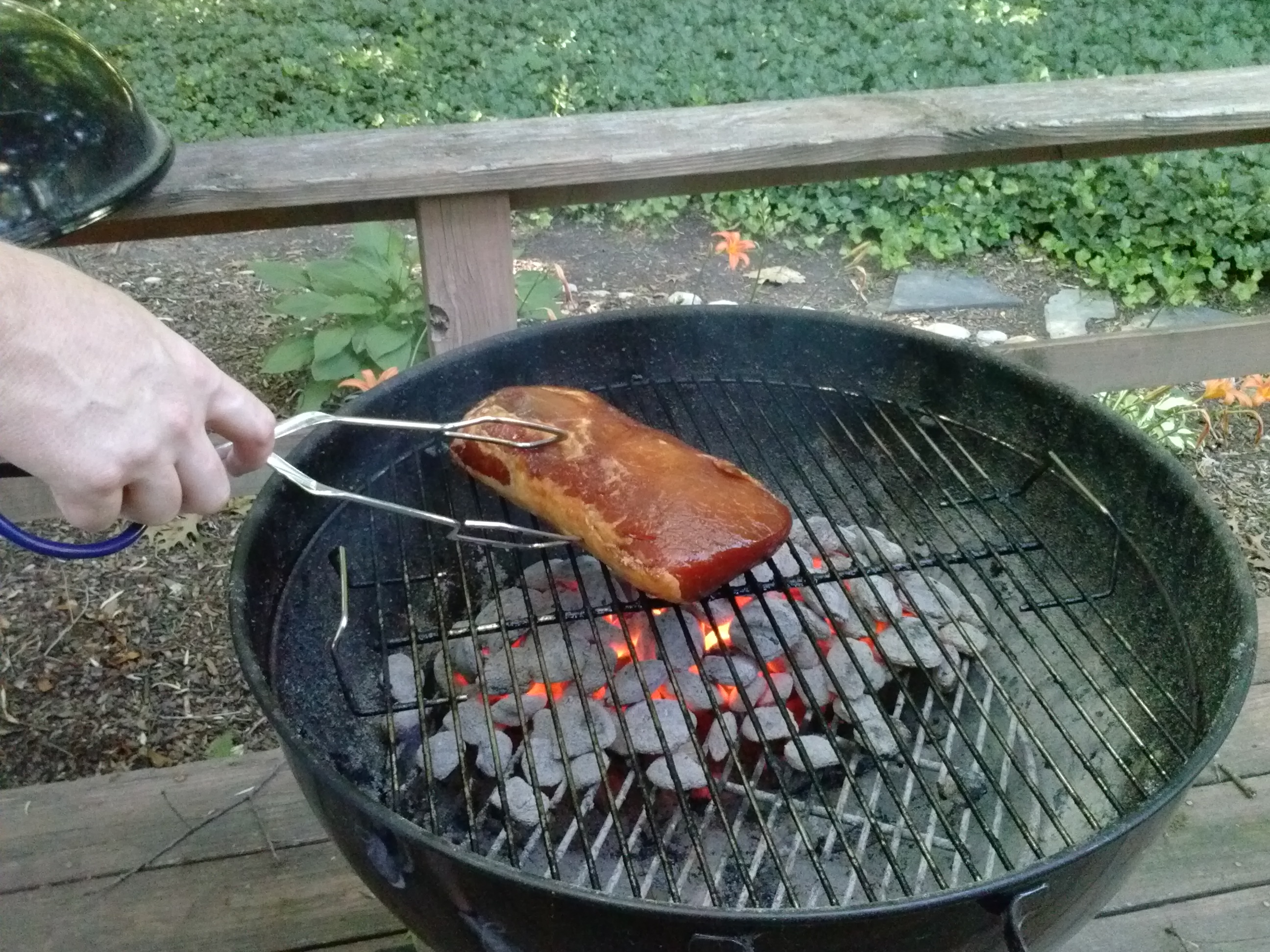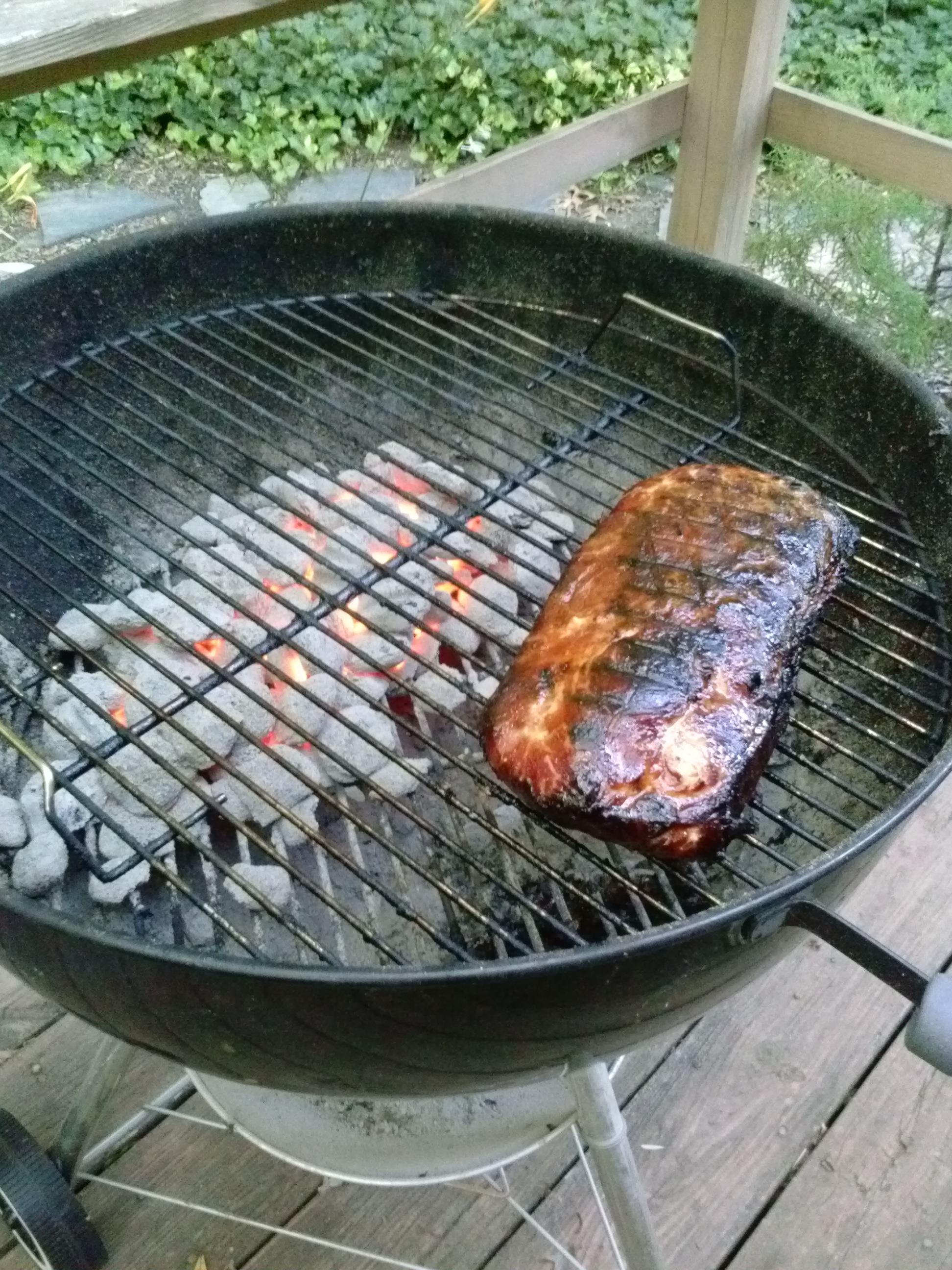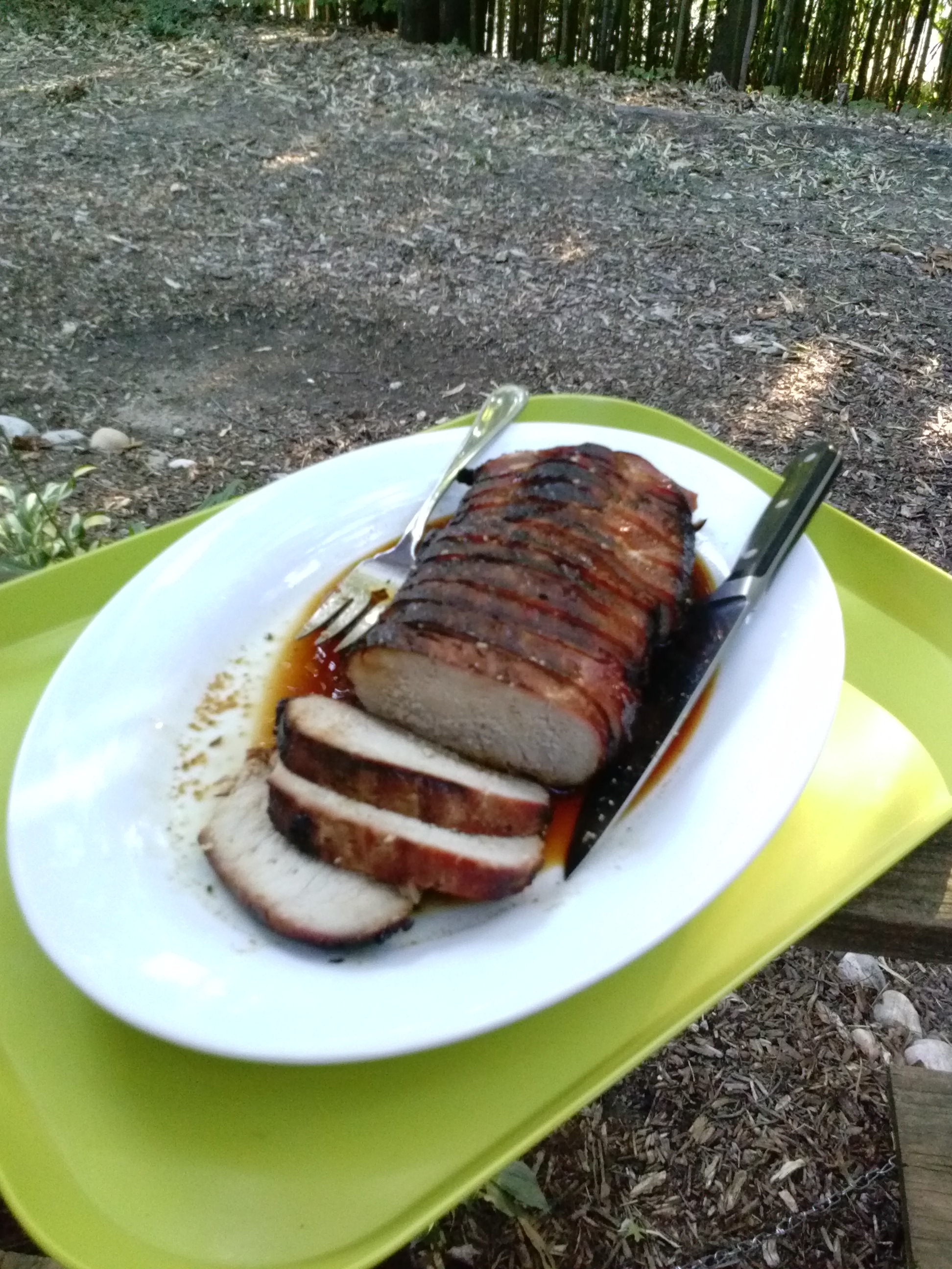 Once the meat started to cook internally, things went fast. After testing the temperature at one point, Brad registered temps of 160 degrees on the ends of the pork tenderloin and 140 degrees in the middle. We pulled the meat off and let it rest. Were I to do this over, I would have pulled the meat off the grill sooner. Our grill probably had temperatures close to 500 degrees, a long way from 350 degrees. (Controlling temperatures is harder with a charcoal grill.) However, our pork tenderloin was still moist and released plenty of juices. If we had pulled it off the grill five minutes earlier, it would have been perfect.